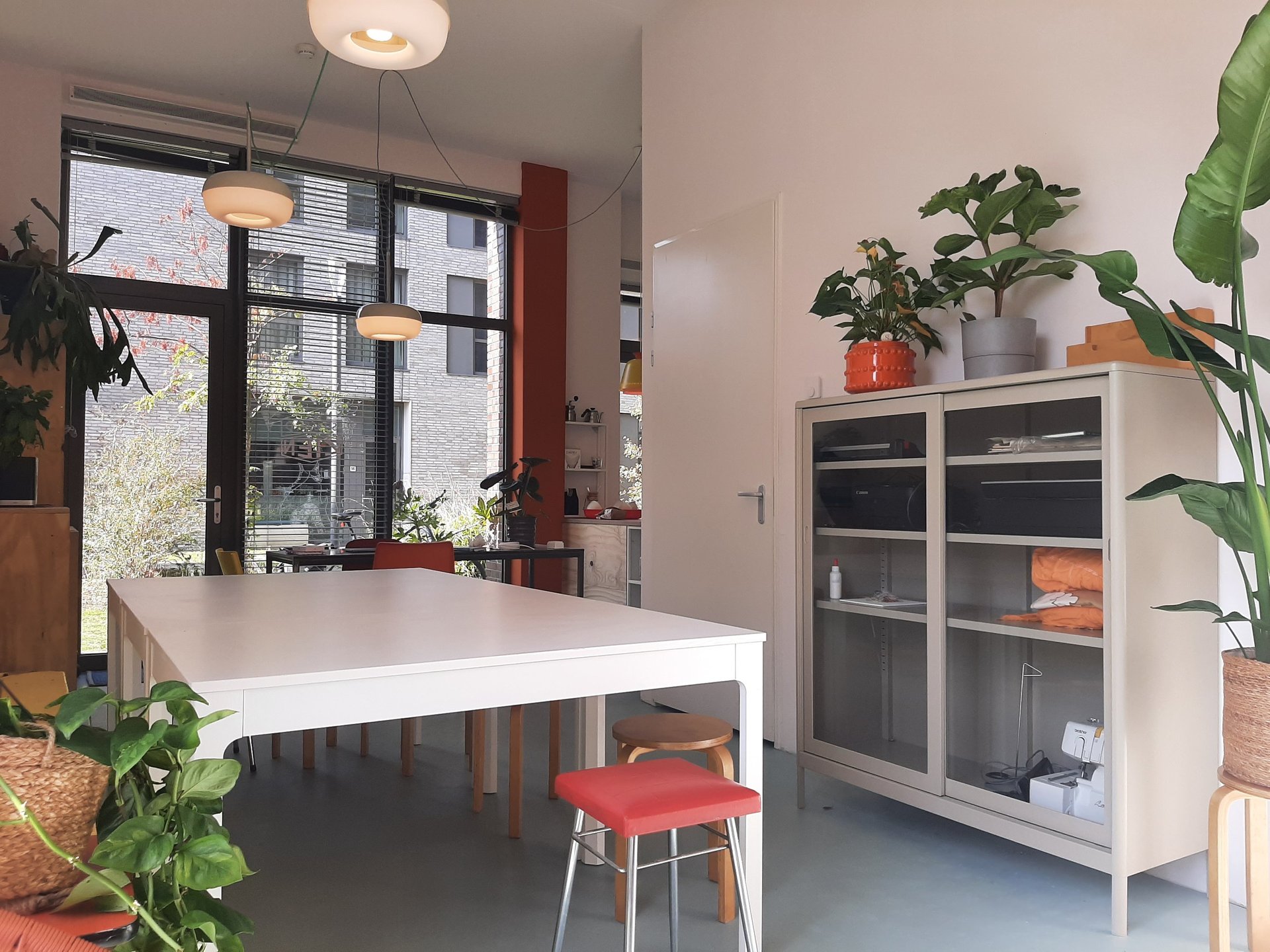 De ruimte voelt als een koffietentje meets atelier — warm, inspirerend en een tikje eigenzinnig.